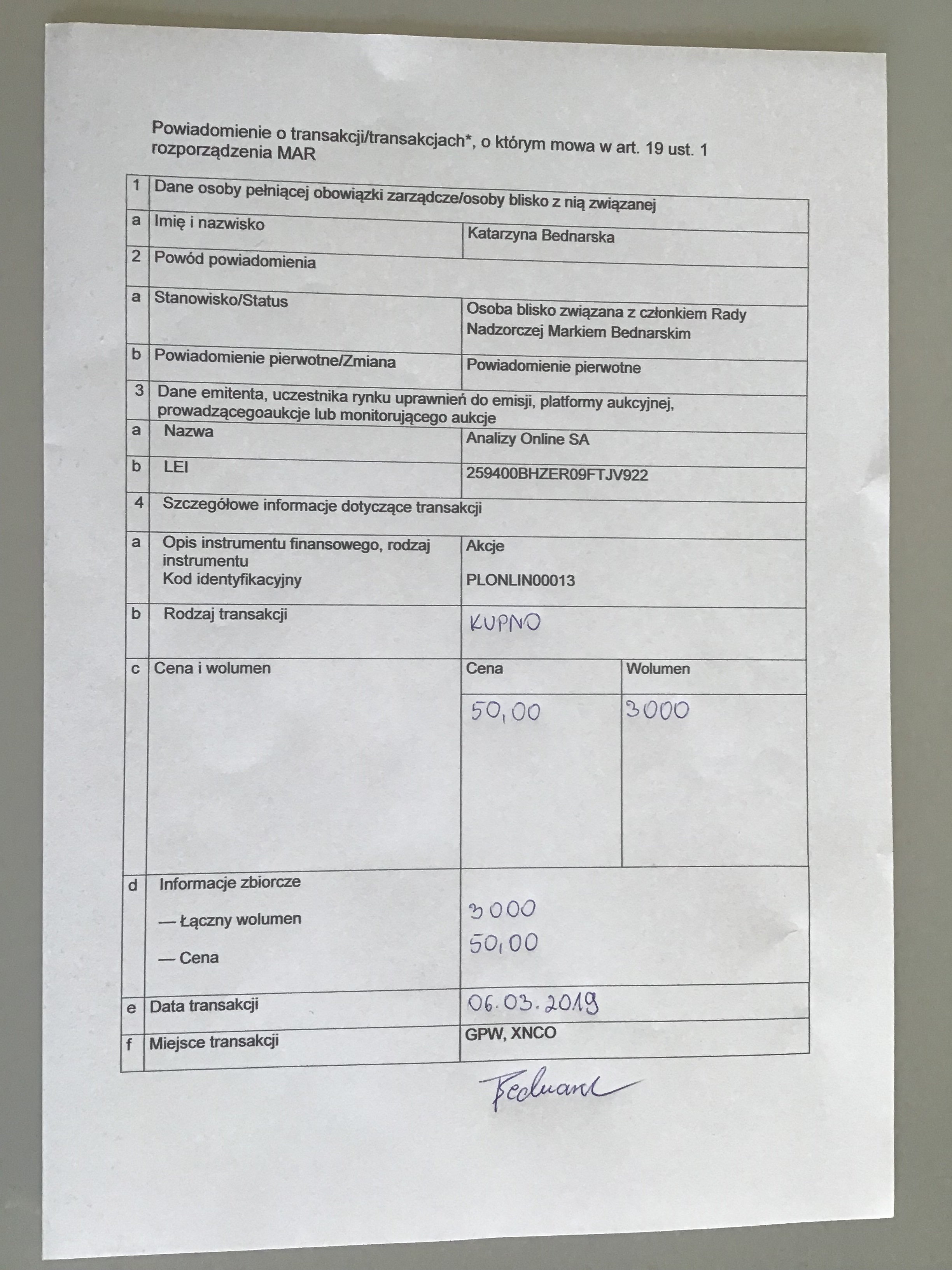 Transakcja Pani Katarzyny Bednarskiej z dnia 13.11.2018 r.