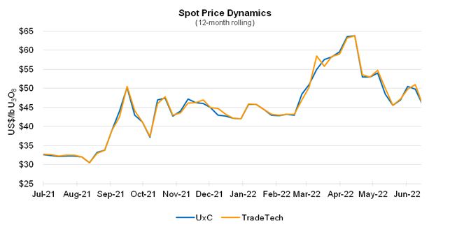 According to third-party market data, intermediaries were responsible for most of the spot market activity through the first half of 2022, with volumes similar to the same period last year. A total of 32.6 million pounds U3O8 (~12,500 tU) was transacted at an average weekly spot price of US$50.30/lb U3O8 year-to-date in 2022, compared to about 35.6 million pounds U3O8 (~13,700 tU) at an average weekly spot price of US$29.95/lb U3O8 in the first six months of 2021.