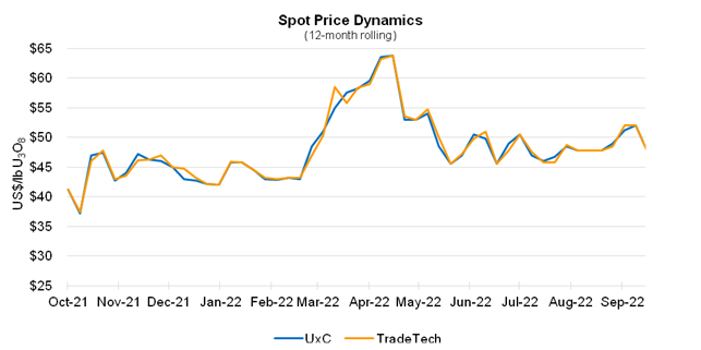Although uranium spot market activity is usually slower throughout the summer months, contracting interest during the summer of 2022 was particularly quiet due to utility customers shifting their attention to potential bottlenecks in the conversion and enrichment segments, as they seek to reduce reliance on Russian processing services. Uranium spot activity was very limited throughout July and August, with the spot price ranging between US$45.00/lb U3O8 and US$50.00/lb U3O8. Activity in the spot market picked up in September pushing the price to US$52.00/lb U3O8. However, with equity markets under pressure and a sharp decline in purchasing activity by financials entities, the price fell back to about US$48.00/lb U3O8 by the end of the quarter.