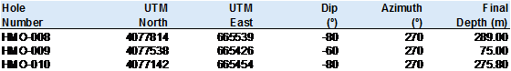 · The third drill hole, (HMO-010) has completed successfully at 275.80m depth.